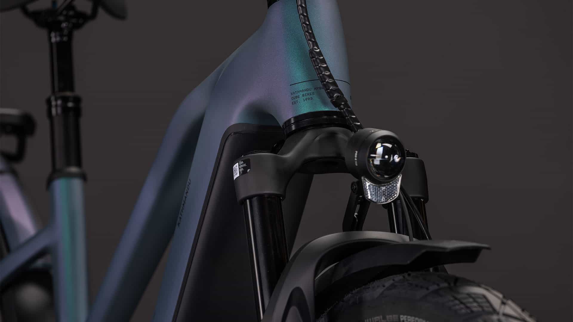 Elegantes, zeitloses Design – das ist das CUBE Kathmandu Hybrid. Auf den ersten Blick zumindest. Ein zweiter gibt den Weg frei auf jede Menge Innovationen und clevere Details. Dabei ist der samt 800 Wh PowerTube Akku ästhetisch und sauber ins Design integrierte CX Motor von Bosch nur eins der Highlights. Ein weiteres ist unsere Efficient Comfort Geometry, die harmonisch mit der 100 mm Federgabel Hand in Hand arbeitet, was die Kontrolle vor allem bei schwierigen Bedingungen optimiert. Dazu die interne Zugverlegung, die den cleanen Look des Chassis unterstreicht. Was noch? Ein vielseitiges, beinahe unzerstörbares UDH für einfache Ersatzteilverfügbarkeit, ein integrierter Kettenschutz und unser stabiler, robuster, überaus formschöner integrierter Gepäckträger IC 3.0, auf dem alles Platz findet, was auf Abenteuertour mit muss.