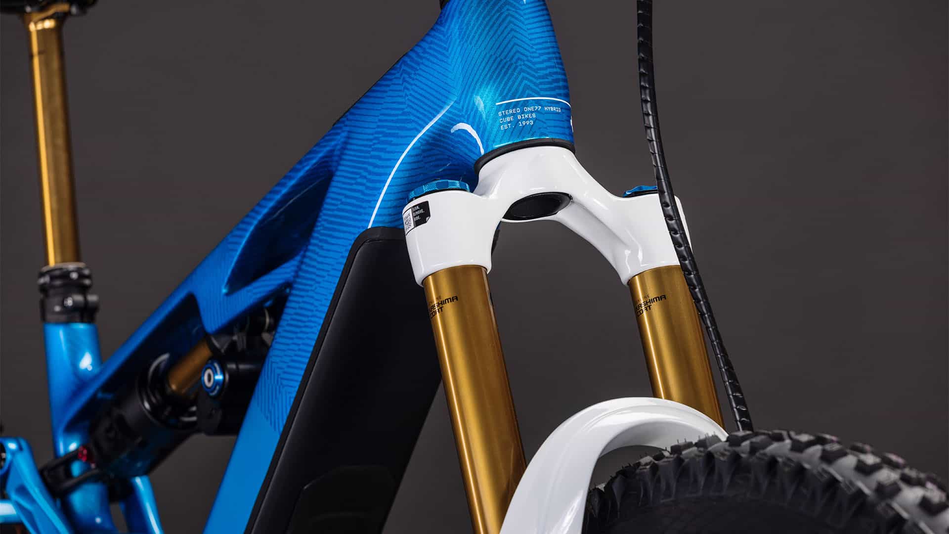 Der Rahmen des Stereo Hybrid ONE77 HPC ist wahrlich eine Klasse für sich, denn hier treffen 170 mm Federweg an der Front und am Heck auf ein Mullet-Set-up mit einem 29 Zoll Vorderrad und 27.5 Zoll Hinterrad. Damit werden Big-Mountain-Trail-Träume wahr! Wie immer bei CUBE maximal detailverliebt konstruiert auch der Rest: Integrated Cable Routing sorgt für einen supercleanen Look. Dazu kommt ein Steuersatz zur Winkelverstellung, mit dem sich das Handling an individuelle Vorlieben und Anforderungen anpassen lässt. Außerdem haben wir den 800 Wh starken PowerTube Akku gleich über dem Bosch CX Motor sauber und formschön ins Carbon-Unterrohr integriert. Für einfachere Ersatzteilverfügbarkeit gibt’s ein UDH am Aluminium-Hinterbau – und weil wir auch eine Direct Mount Kettenführung verbaut haben, geht’s mit diesem Fully selbst bei schwierigen Bedingungen weiter, weiter und immer weiter.